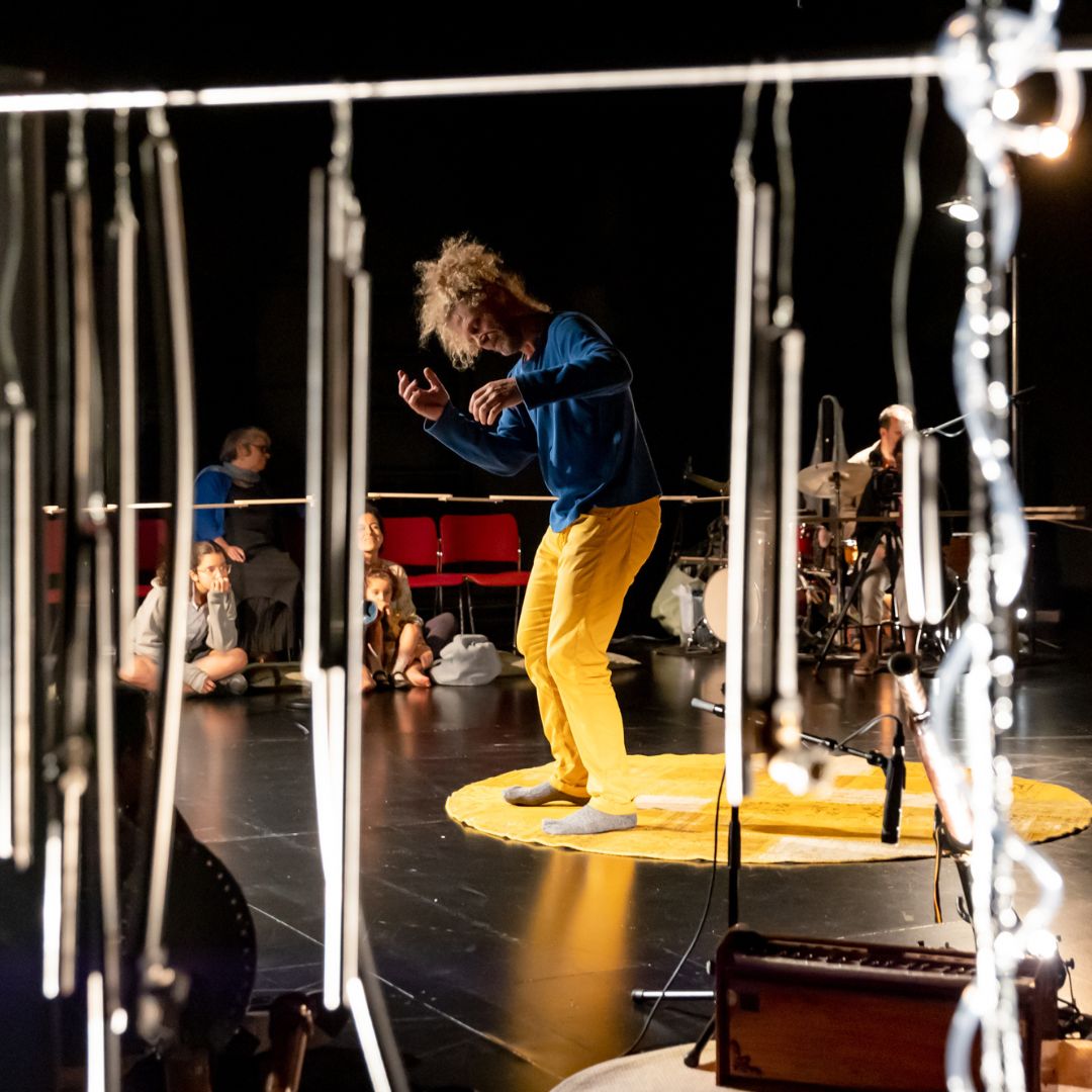 Dois músicos-performers estão no meio do público, abolindo o dentro-fora, o palco-plateia. Toda a gente a partilhar a mesma toca, protegendo-se e cuidando uns dos outros. Lá fora pode chover ou fazer frio, mas aqui estamos quentinhos e a fazer por estar bem. Temos direito, não é?