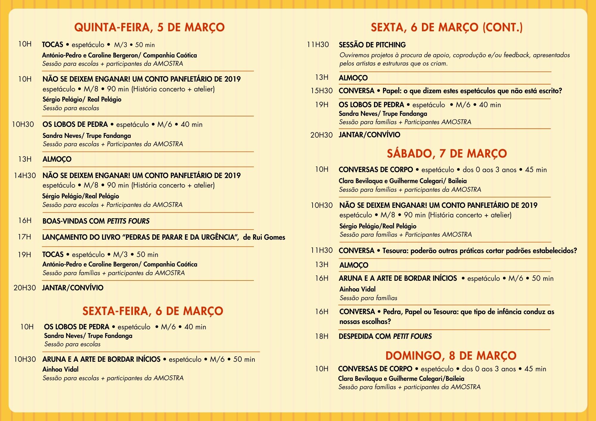 AMOSTRA é um festival para Público Jovem e Famílias, com espetáculos que acontecem em vários espaços da cidade de Viseu. Em paralelo convoca também um encontro para profissionais do setor com atividades dedicadas para este público.